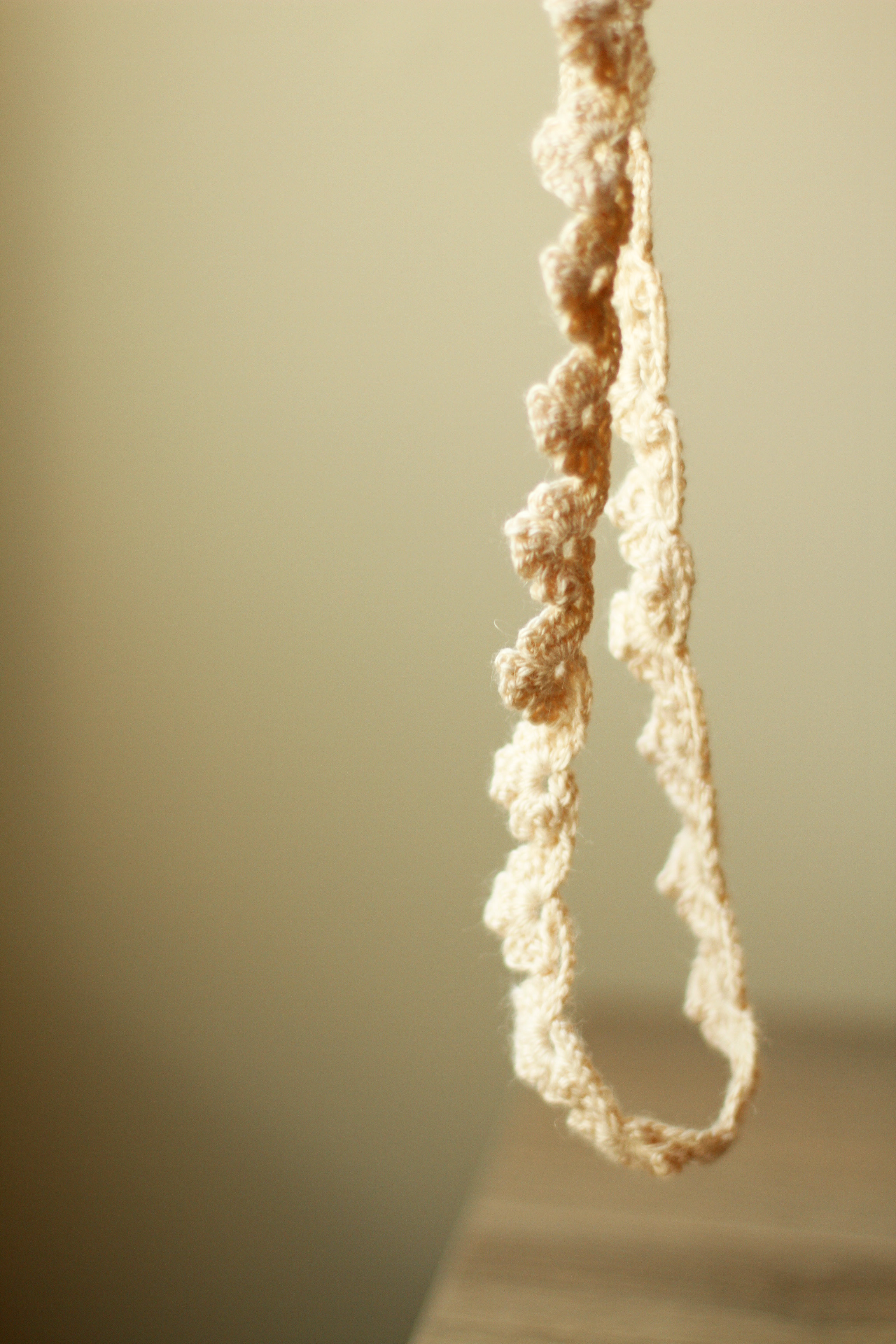 *Når du har den første blomsten ferdig hekler du 11 luftmasker, 1 stav i den 4. luftmasken fra nålen, 3 luftmasker, 1 stav i ringen og 1 kjedemaske i mellom 2 staver på den sist heklede blomsterbladet. Snu arbeidet og hekl 1 stav i ringen, 3 luftmasker, 1 kjedemaske i ringen. Så hekler du to vanlige blomsterblader som beskrevet over. Gjenta fra * til borden er så lang som du ønsker. Dra tråden igjennom den siste masken.