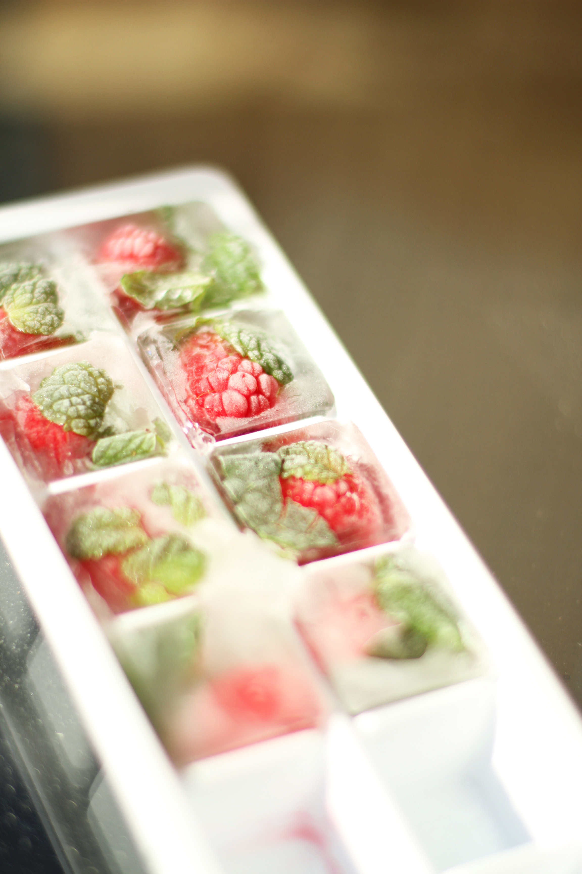 1. Legg et bringebær og noen mynte blader i hver isbit-form.