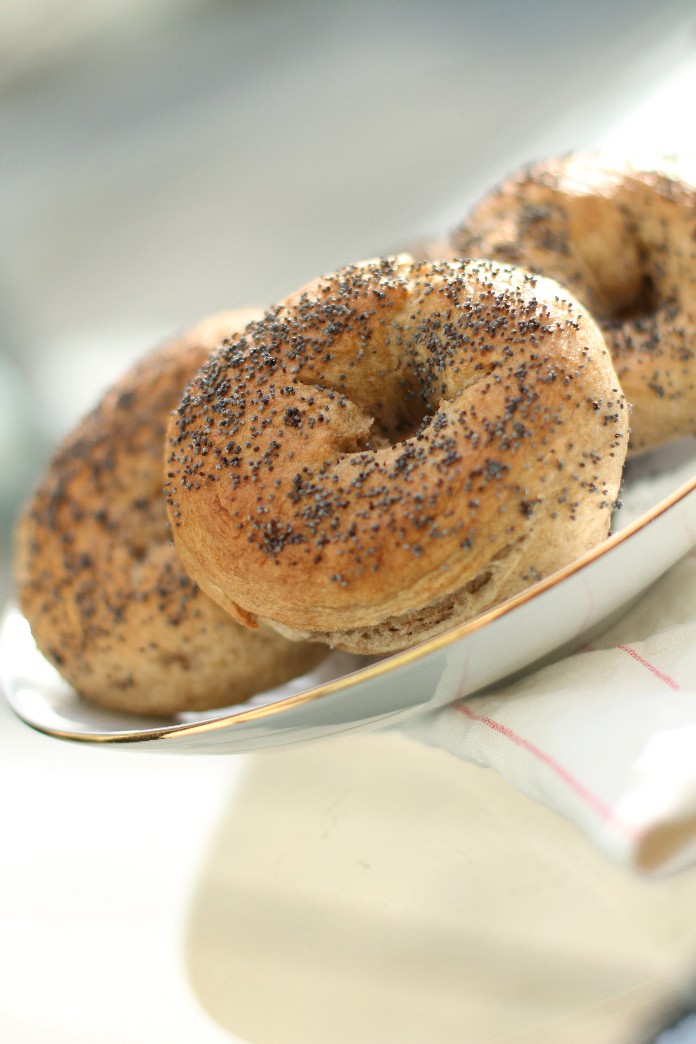 7. Kok opp 4 liter vann med 8 ss sukker blandet inn. Legg i et par bagels om gangen og la de koke ca. 2 minutter på hver side.