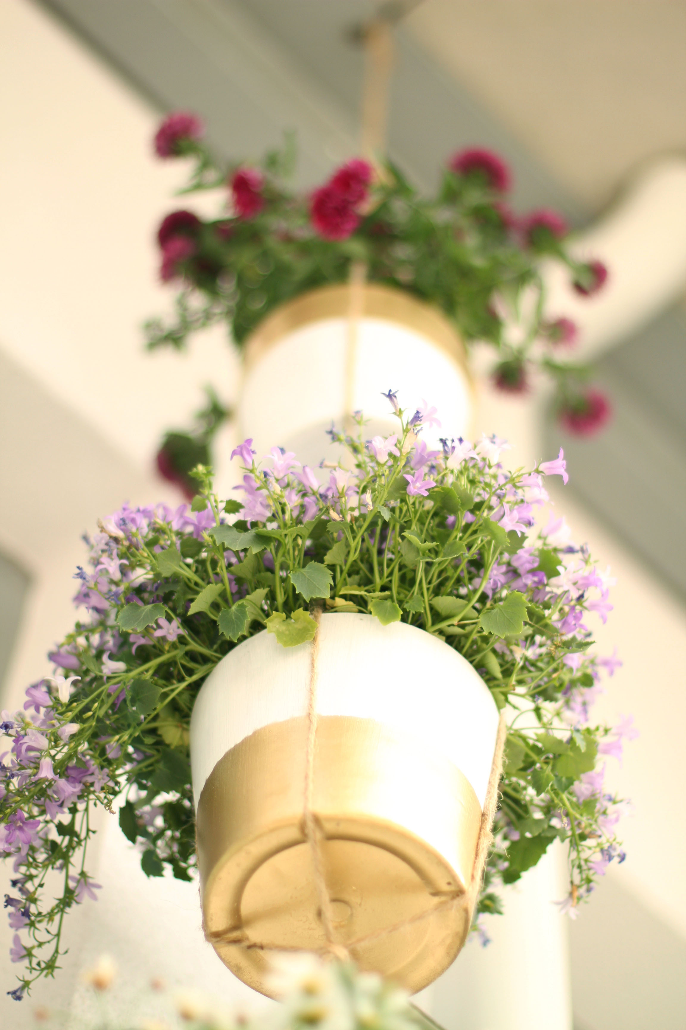 Det siste man må gjøre er å plante noen nydelige blomster i pottene og henge opp ampelen.