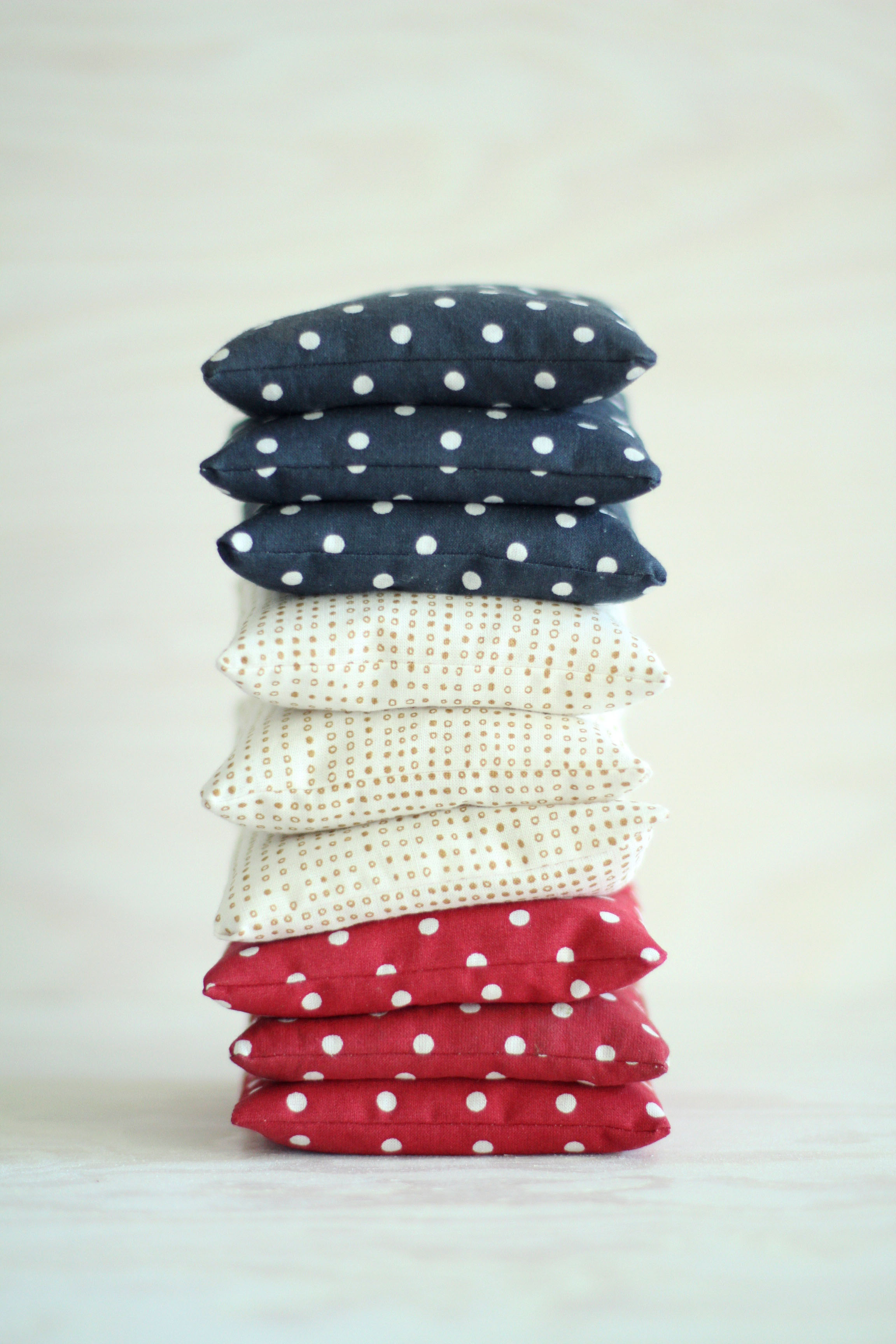 1. Start med å klippe opp kvadrater i størrelsen 12×12 cm. Hver pose trenger to lapper, og siden det er 17.mai valgte jeg å lage 3 poser i hver farge: rødt, hvitt og blått.