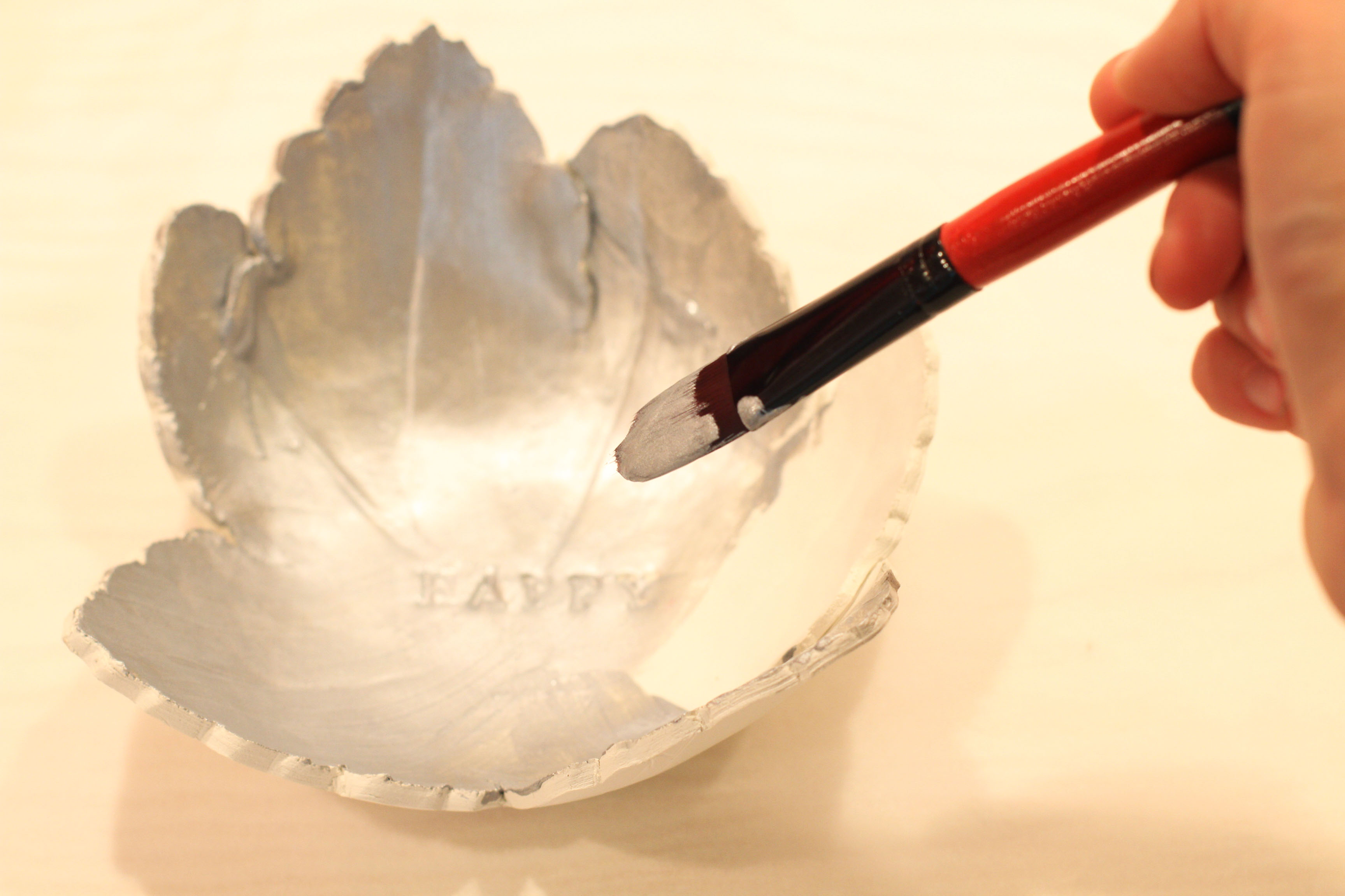 8. Mal skålen i sølv farget maling. Jeg malte to stråk for at det skulle dekkes ordentlig.